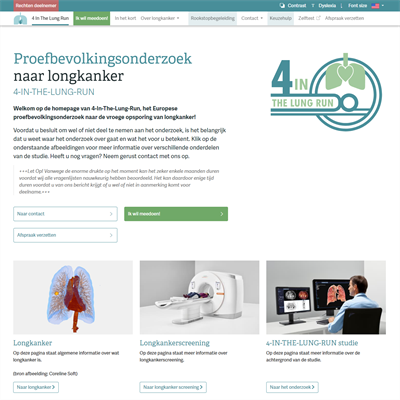 Website 4 in the lung run Voor 4-In-The-Lung-Run hebben we deze website opgezet door middel van het DotNetNuke CMS. 4-In-The-Lung-Run is het Europese proefbevolkingsonderzoek naar de vroege opsporing van longkanker. Website 4 in the lung run