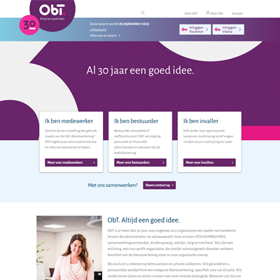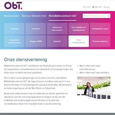 Corporate website ObT BitWise heeft de corporate website gerealiseerd voor ObT. Bezoekers vinden daar alle informatie over de organisatie. Daarnaast kunnen medewerkers en directieleden van aangesloten scholen diverse... Corporate website ObT